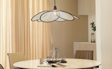 Galda lampas ar vasaras ziedu, jūras medūzu, spārnu, pumpuru un lapu motīviem piešķir ekstravagantu noskaņu mūsu labsajūtas zonām. Silti balta krāsa ir obligāta, lai spēlētos ar gaismu, tāpat kā mājīga aptumšošanas iespēja.