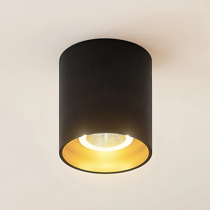 Zaki LED griestu gaisma stilīgā melnā un zelta krāsā Zaki LED griestu gaisma ir pievilcīga un minimālisma griestu apgaismojuma izvēle. Tas ir izgatavots no alumīnija, un tā cilindriskā abažūra ārpuse ir melna. Gaismekļa iekšpuse ir nokrāsota pārsteidzošā zelta krāsā, un tā ieskauj iebūvētās gaismas diodes. Uz leju atveramais abažūrs nodrošina telpas apgaismojumu bez atspīdumiem, un zeltainās sienas rada arī aizraujošu krāsu atspīdumu. Zaki LED griestu lampas kompaktais dizains ne tikai ietaupa vietu, bet arī veido skaistus akcentus viesistabā vai ēdamistabā un atrod piemērotu vietu visdažādākajos mēbeļu stilos.