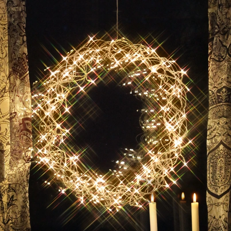 Ziemassvētku LED vainags Curly - daudzas mazas LED diodes izstaro maigu gaismas mirdzumu LED vainags Curly ir skaists Ziemassvētku sezonas rotājums, kas rada svētku atmosfēru ar silti baltu LED gaismu. Vainags ne tikai labi rotā logu vai brīvi novietots telpā, bet arī izskatās ļoti dekoratīvi un aicinoši uz durvīm. Piegādes kabeļa garums ir 3,5 m. Komplektā ir iekļauts transformators.