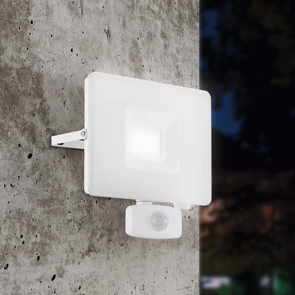 Faedo 3 LED āra prožektors baltā krāsā ar kustības sensoru Baltais Faedo 3 LED āra prožektors vienmēr nodrošina spilgtumu, kad tas ir nepieciešams, jo prožektors ir aprīkots ar kustības sensoru. To var uzstādīt pie sienas, zem jumta pārkares vai ēkas stūrī, izmantojot montāžas kronšteinu, un to var pagriezt kronšteinā. Aiz caurspīdīga stikla vāka atrodas energoefektīvas gaismas diodes, kas nodrošina universālu baltu apgaismojumu. Kustības sensora dati: - Maksimālais darbības rādiuss 12 metri - Detekcijas leņķis 120° - Reakcijas spilgtums regulējams no 5 līdz 2000 luksiem - Ieslēgšanas laiks regulējams no 5 sekundēm līdz 60 minūtēm