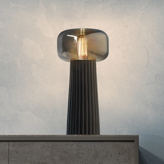 Faro galda lampa ar plastmasas pamatni un stikla abažūru Interesantā Faro galda lampa sastāv no nedaudz konusveida plastmasas pamatnes ar rievotu rakstu visapkārt un noapaļotas, cilindriskas formas stikla abažūra. Šo lampu projektēja Maria Khachikyan uzņēmumam Mantra. Tā ir aprīkota ar pārslēdzamu slēdzi kabeļa daļā, un tai var uzstādīt līdz 20 W gaismas avotu (LED).