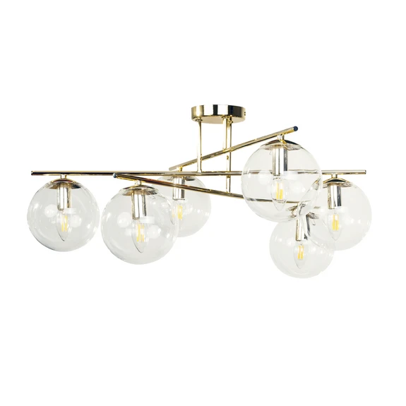 Metāla un stikla griestu lampa Zoe apvieno stilīgu dizainu ar praktisku funkcionalitāti. Ar savu sešu gaismas avotu konstrukciju tas nodrošina vienmērīgu un patīkamu apgaismojumu dažādās dzīvojamās telpās, piemēram, ēdamistabā, virtuvē, viesistabā, guļamistabā un gaitenī. Zelta krāsas metāla un caurspīdīga stikla kombinācija piešķir lampai mūžīgu eleganci, kas harmoniski iekļaujas dažādos interjera stilos.