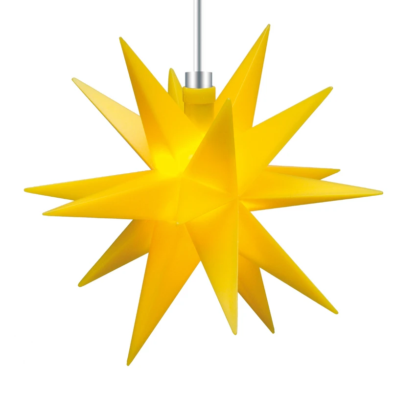 Ar baterijām darbināma LED zvaigzne ar 18 punktiem atmosfēriskam interjera dekoram Šīs skaistās plastmasas zvaigznes ar 18 punktiem skats - kā dekoru pie loga vai brīvi iekārtas telpā - liks jums gaidīt Ziemassvētkus. Dekoratīvo zvaigzni izgaismo LED diodes, kuru gaisma īpaši skaisti izceļ neparasto formu ar daudziem punktiem. Komplektā iekļautajā bateriju nodalījumā var ievietot trīs AA baterijas. Piemērotas baterijas ir pieejamas atsevišķi no piederumiem - Komplektā ir taimeris - Caurspīdīgs kabelis
