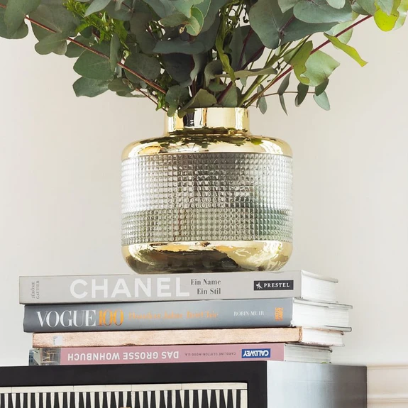 LA Noble vāze no rievota stikla ar zelta akcentiem - roku darbs LA Noble ir neliela stikla vāze puķēm ar aizraujošu dizaina kombināciju, kurā ir rievotas, caurspīdīgas virsmas un gludi laukumi zelta krāsā. Tā vēl krāšņāk izceļ sulīgus ziedu krāšņumus, piemēram, peonijas, ranunculus un dālijas. Vienkāršajam grafiskajam stikla reljefam piešķir spožu izskatu ar spīdīgiem zelta akcentiem.