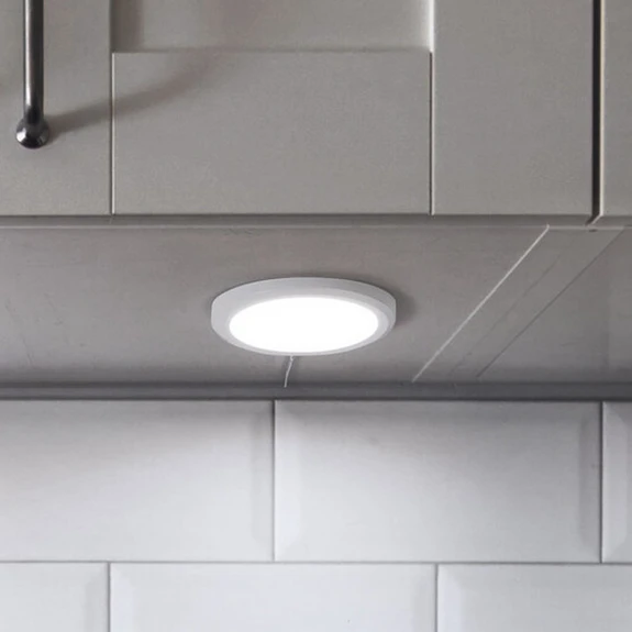LED gaisma zem skapja Smart+ Zem skapja apaļa 3 gabaliņu komplektā Šis trīs LED gaismu komplekts zem skapja, ko var gudri integrēt, izmantojot WLAN, ir īpaši piemērots uzstādīšanai zem virtuves sienas skapīšiem, kā arī uz plauktiem viesistabā. Izmantojot lietotni Ledvance Smart+, kas Android un iOS operētājsistēmām ir pieejama bez maksas, gaismu var vadīt, izmantojot viedtālruni/tableti. Apgaismes ķermeņi zem skapīšiem ir viegli uzstādāmi, un tie tiek piegādāti kopā ar montāžas materiāliem, kas paredzēti pieskrūvēšanai vai piestiprināšanai ar līmi vai magnētu. Komplektā ir iekļauts arī Šveices kontaktdakša (IP20) strāvas padevei caur kontaktligzdu - Gaismas krāsa regulējama no silti baltas (3000 K) līdz dienas gaismai (6500 K) - Regulējams aptumšojums - Iespējama balss vadība, izmantojot Google Assistant vai Amazon Alexa