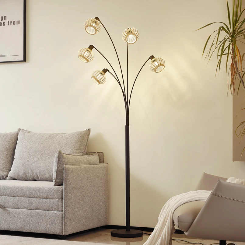 Lielle stāvlampa ar pieciem abažūriem - lauku noskaņa ēdamistabām un viesistabām Atklājiet Lielle stāvlampu - dizaina šedevru, kas ar 5 spuldzēm ne tikai piešķir telpām gaismu, bet arī siltu atmosfēru. Bambusa un dzelzs kombinācija koka un melnajos krāsu toņos piešķir šai lampai rustikālu šarmu, kas nevainojami iederas lauku stila ēdamistabas un viesistabas atmosfērā. Lielle ir viegli vadāma, izmantojot kājsavienotāju, un to var aprīkot ar E27 spuldzēm.