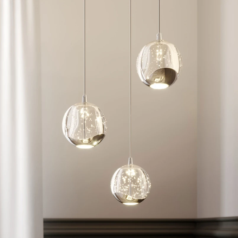 Trīs gaismu LED piekaramā lampa Hayley ar īpašiem gaismas efektiem un sfēriskiem stikla abažūriem Hayley ir ar LED darbināma, enerģiju taupoša LED piekaramā lampa ar dekoratīviem elementiem hromētā krāsā un trim stikla abažūriem ar dekoratīvu burbuļveida struktūru, kas rada unikālus gaismas efektus. Spīdīgais hroms izskatās īpaši eleganti, tāpat kā abažūri ar burbuļiem. Tas padara Hayley par gaismekli ar augstu glamūra faktoru, kura trīs lampu versija ir īpaši piemērota izmantošanai virs ēdamgalda. Gaisma tiek izstarota gan tieši, gan netieši, un tur, kur redzams tiešās gaismas komponents, ir balts stikla elements maigai gaismas izplatīšanai, savukārt pārējo stikla abažūru raksturo pievilcīgs burbuļstikls, kas ir caurspīdīgs un starojošs.
