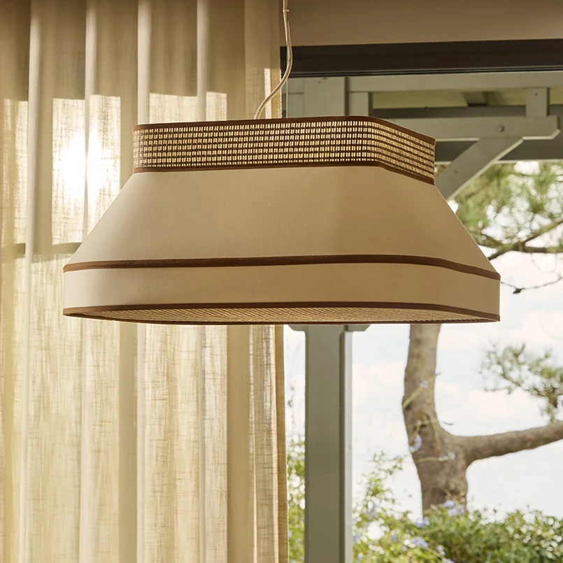 MARKET SET piekaramā lampa Square apvieno stilīgu dizainu ar augstas kvalitātes materiāliem, piemēram, audumu, FSC sertificētu papīra pīti un metālu. Ar savu krēmkrāsas un gaiši brūno krāsu to var harmoniski iekļaut dažādos interjera risinājumos, piešķirot telpai diskrētu akcentu. Ģeometriskā forma piešķir lampai modernu un mūžīgu estētiku, kas ir ideāli piemērota ēdamistabai, guļamistabai vai viesistabai.