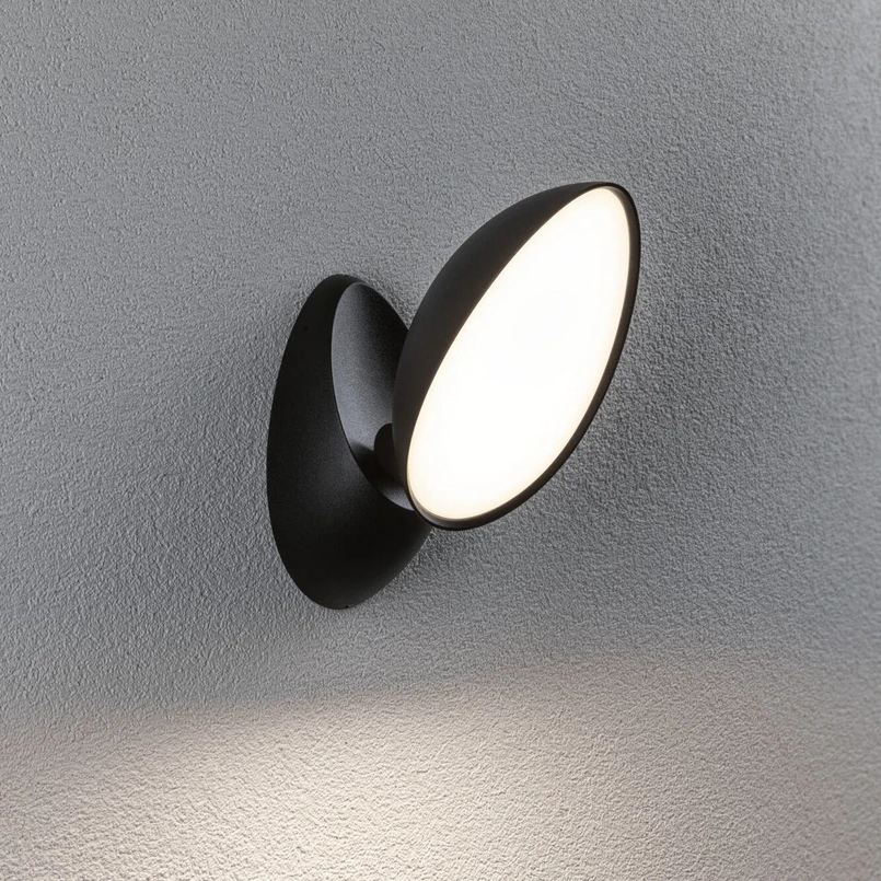 Antracīta krāsas LED āra sienas lampa Batona ar noliektu galviņu Silti baltai Batona LED āra sienas lampai ir apaļš, mūsdienīgs dizains. Antracīta krāsas alumīnija konstrukcija ir aprīkota ar uz priekšu nolokāmu galviņu. Tas ļauj plakano, silti balto gaismu no iebūvētā LED moduļa novirzīt uz priekšu vai uz leju - Aizsardzības kategorija: IP44