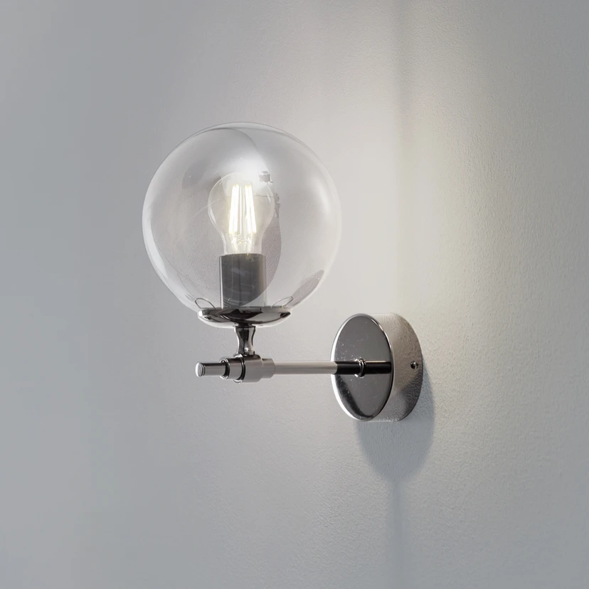 Portemo sienas lampa ar dūmakaini pelēka stikla abažūru un niķeļa krāsas konstrukciju Mūsdienīgajai Portemo sienas lampai ir sfērisks abažūrs, ko balsta niķeļa krāsas metāla konstrukcija. Abažūra dūmakaini pelēkais stikls piešķir sienas lampai dekoratīvu akcentu, ko var ideāli papildināt ar spuldzīti ar filamenta izskatu.