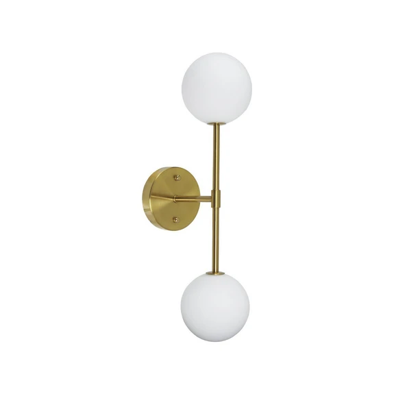 PR Home Sigma D sienas gaismeklis: Stikla un metāla simfonija PR Home Sigma D sienas lampa apvieno stilīgu dizainu un funkcionālu apgaismojumu. Tas pārsteidz ar zelta krāsas metāla konstrukcijas un divu sfērisku opāla stikla abažūru kombināciju, kas vērsti uz augšu un uz leju. Katrā no tiem ir G9 spuldzes ligzda; komplektā ir iekļautas silti baltas, dimmējamas LED spuldzes.