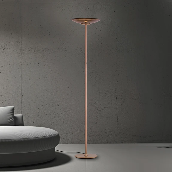 Moon LED stāvlampa ar izliektu stikla abažūru - aprīkota ar skārienjūtīgu reostatslēdētāju Moon LED stāvlampa ir eleganta dizaina gaismas avots, kas sader ar daudzām modernām mēbeļu koncepcijām. Konstrukciju veido apaļš alumīnija rāmis un stikla abažūrs apaļā, plakana un uz leju izliekta formā. Tās centrā ir silti balts LED modulis, kura gaisma tiek izstarota uz augšu. Tādējādi grīdas lampa Moon nodrošina netiešu apgaismojumu kā griestu lampas. Spilgtumu var regulēt, izmantojot skārienjūtīgo regulatoru uz statīva caurules.