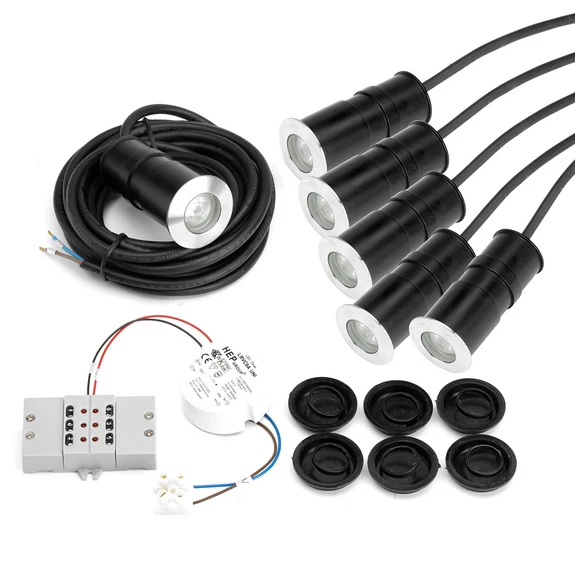 Izturīgs D-CO R LED padziļinājumā iebūvēts grīdas apgaismojums 6 gabalu komplektā Šis sešu vadu LED padziļinājumā iebūvētu grīdas lampu komplekts nodrošina akcenta un orientējošu apgaismojumu iekštelpās un ārpus telpām. D-CO R ir apaļa konstrukcija; nerūsējošā tērauda pārsega gredzens un rūdītais stikls nodrošina augstu izturību pret mitrumu un mehānisko slodzi. Tāpēc D-CO R var uzstādīt, piemēram, celiņos vai telpās ar mēbelēm, bet var izmantot arī kā baseina apgaismojumu. Ja viens gaismeklis nedarbojas, tas neietekmē pārējo gaismekļu darbību. Gaisma tiek izstarota ļoti šaurā vertikālā konusā, kas ir 12°. Korpuss un pamatnes montāžas trauks ir izgatavoti no alumīnija. Vadības ierīce ir integrēta kabeļu sadales kārbā (astoņas kontaktligzdas). Komplektā ir iekļauts arī caurvadei piemērots multikonektors - Gaismas izstarošana: 100 % uz leju (šaurs staru kūlis) - Svars: 1,3 kg - Triecienizturība: IK10 - Aizsardzības kategorija: IP68 - Slodze: līdz 500 kg