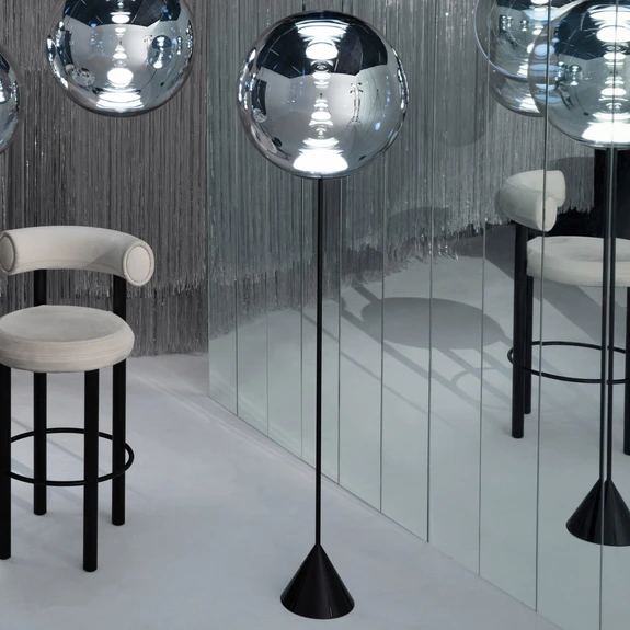 Eleganta Globe Cone LED stāvlampa ar spoguļstikla formas abažūru Globe Cone LED stāvlampa ir ar plānu, melnu ietvaru ar konusveida pamatni un sfēras formas abažūru, kas ir galvenā gaismekļa iezīme. Kad lampa ir izslēgta, spoguļattēls no polikarbonāta atstaro citus telpā esošos priekšmetus. Tiklīdz stāvlampa ir ieslēgta, ir redzams iekšpusē uzstādītais LED gaismas avots, un silti balta gaisma daļēji tiek izstarota tieši, daļēji lauzta un daļēji atstarota, radot atmosfērisku apgaismojuma efektu. Globe Cone ir īpaši efektīgs modernos interjeros, un, pateicoties tā pievilcīgajam dizainam, tas var kļūt par interjera centrālo elementu. Globe gaismekļu sēriju ir radījis ievērojamais britu interjera dizainers Tom Dixon, kura uzņēmums ar tādu pašu nosaukumu ražo stāvlampas izcilas kvalitātes.