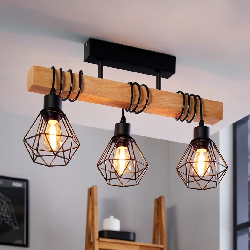 Townshend 5 griestu gaisma melnā krāsā ar koka izskatu Šī elegantā griestu gaisma ir no pazīstamā apgaismojuma ražotāja Eglo. Townshend 5 apvieno mūsdienīgu dizainu ar ilgtspējīgiem materiāliem un, pateicoties vienkāršai konstrukcijai, iederas dažādās vidēs. Townshend 5 trijos elegantajos būrīšos var ievietot atsevišķus gaismas avotus. Abažūri karājas uz trosēm, kas apvītas ap rustikālu koka elementu. Visi pārējie komponenti ir izgatavoti no izturīga tērauda klasiskā melnā krāsā. Griestu lampas atturīgais dizains un kompaktā konstrukcija ļauj to integrēt dažādās apgaismojuma koncepcijās.