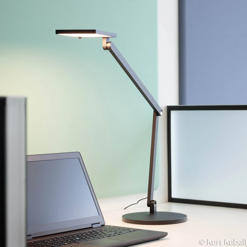 Regulējama darba galda LED lampa ar sensora vadību un apaļu galda pamatni Darba galda LED lampa Task ir absolūti elastīgs darba gaismas avots modernam birojam vai kabinetam. Tā ir izgatavota no alumīnija un sastāv no apaļas pamatnes, slaida, divdaļīga rāmja un plakanas, taisnstūra formas lampas galvas. Rāmi var noliekt uz priekšu vai atpakaļ pie pamatnes un savienojuma starp abām rokas daļām. Galviņu var orientēt arī ar savienojumu, lai vienmēr varētu apgaismot vajadzīgo zonu. Iebūvēto LED gaisma ir savienota sānos, ar lāzera gravējumu novirzīta uz leju un izstarota caur opāla PMMA vāku, lai panāktu absolūti viendabīgu apgaismojumu. Galvas augšpusē iebūvētais skārienjūtīgais sensors ļauj pārslēgt ar ātru pārvelkšanu vai pieskārienu un aptumšot ar pirksta turēšanu. Ja nepieciešams, var aktivizēt apakšpusē izvietoto klātbūtnes sensoru, lai noteiktu kustību detektēšanas zonā. Tas automātiski izslēdz gaismu pēc 15 minūšu prombūtnes un atkal ieslēdz to, kad atgriežaties darba vietā - Komplektā ietilpst galda pamatne un savienojuma kabelis ar strāvas padevi - Sensora detektēšanas diapazons: 100° leņķis, maksimālais diapazons 5 m, maksimālais rādiuss 11 m - Galvas regulēšanas diapazons: 360° rotācija, 180° vertikāla pagriešana, 30° sānu pagriešana - Reostats: 100 % līdz 10 % - Ar USB uzlādes ligzdu viedtālruņiem u. c.