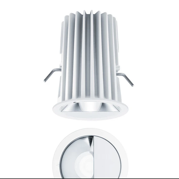 Diamo iebūvējamais LED griestu gaismeklis ar Bluetooth pieslēgumu, sienas mazgātāju un regulējamu balto krāsu Zumtobel iebūvējamais griestu gaismeklis Diamo ir pilnībā moderns gaismas avots: Šajā versijā apvienots neuzkrītošais gaismekļu sērijas izskats ar daudzpusīgu un gudri regulējamu gaismu, kam piemīt uz leju vērsta wallwasher rakstura gaisma. Tāpēc Diamo ir īpaši piemērots netiešam apkārtējās vides apgaismojumam vai sienu dekorāciju prezentēšanai. Sienas mazgātāja efekts tiek panākts ar pussānu ekrānu, kas no istabas puses aizsedz atstarotāju, kas izgatavots no ļoti spīdīga īpaši tīra alumīnija. Plakanais pārsega gredzens kalpo kā ietvars ap atstarotāju. Lietais alumīnija korpuss ar dzesēšanas ribām, ārējā balastspuldzes kārba un gaismekļa skrūvju stiprinājums atrodas virs montāžas atveres un ir neredzams novērotājam. Diamo krāsu temperatūru un spilgtumu var kontrolēt, izmantojot Bluetooth, izmantojot lietotni. To var uzstādīt no 1 līdz 25 mm biezos griestos; tie nedrīkst būt izgatavoti no metāla vai betona. Pēc izvēles padziļinājumā iebūvēto gaismekli var aizsargāt no ūdens šļakatām ar vāku (skatīt piederumus) - BasicDIM funkcija: vadāma, izmantojot bezmaksas 4remote BT lietotni Android un iOS operētājsistēmām - Mesh funkcija: komandu pārsūtīšana paraugiem, kas atrodas ārpus tiešā Bluetooth diapazona (maksimālais attālums viens no otra 4 m) - Mesh funkcija: komandu pārsūtīšana paraugiem, kas atrodas ārpus tiešā Bluetooth diapazona (maksimālais attālums viens no otra 4 m). Bluetooth: maksimālais darbības rādiuss 6 m; radio frekvence 2,4 - 2,483 GHz; radio pārraides jauda +4 dBm - Gaismas emisija: 100 % uz leju (zema gaisma, asimetriska) - Krāsu atrašanās vietas tolerance (sākotnējā Makadama): 3 - Tehniskās apkopes kategorija: D - slēgta - Svars: 0,74 kg
